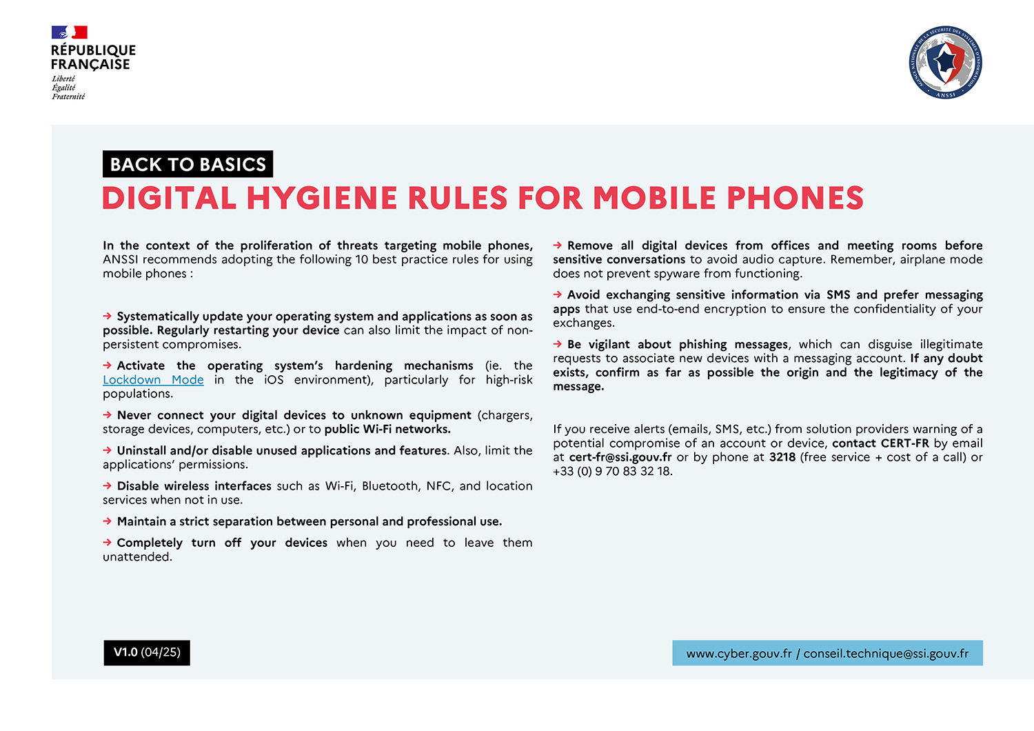 In the context of the proliferation of threats targeting mobile phones, ANSSI recommends adopting 10 best practice rules for using mobile phones.