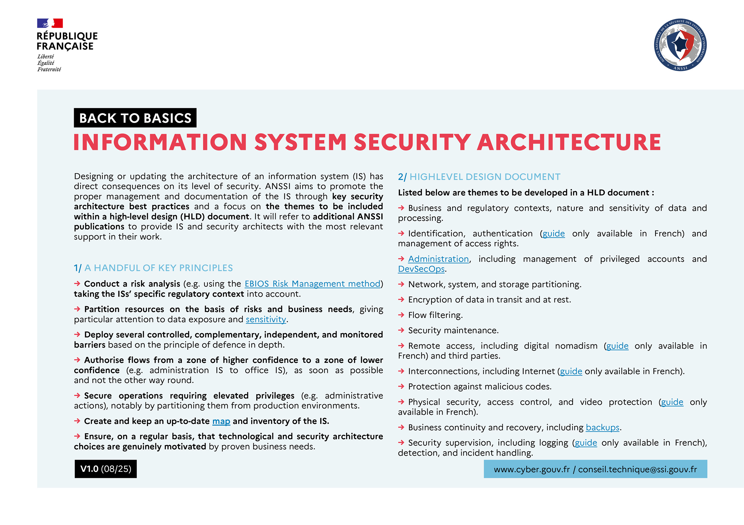 ANSSI's Back to Basics aim to enlighten all our readers, whatever their level of technical knowledge, on the major challenges of cybersecurity. They reflect the agency's point of view at the time of publication, and are not intended as detailed recommendations, like our guides. Rather, they set out independent best practices that can be implemented in a complementary manner. These recommendations are likely to be regularly updated in line with developments in the threat environment, the technologies used, our feedback, etc.