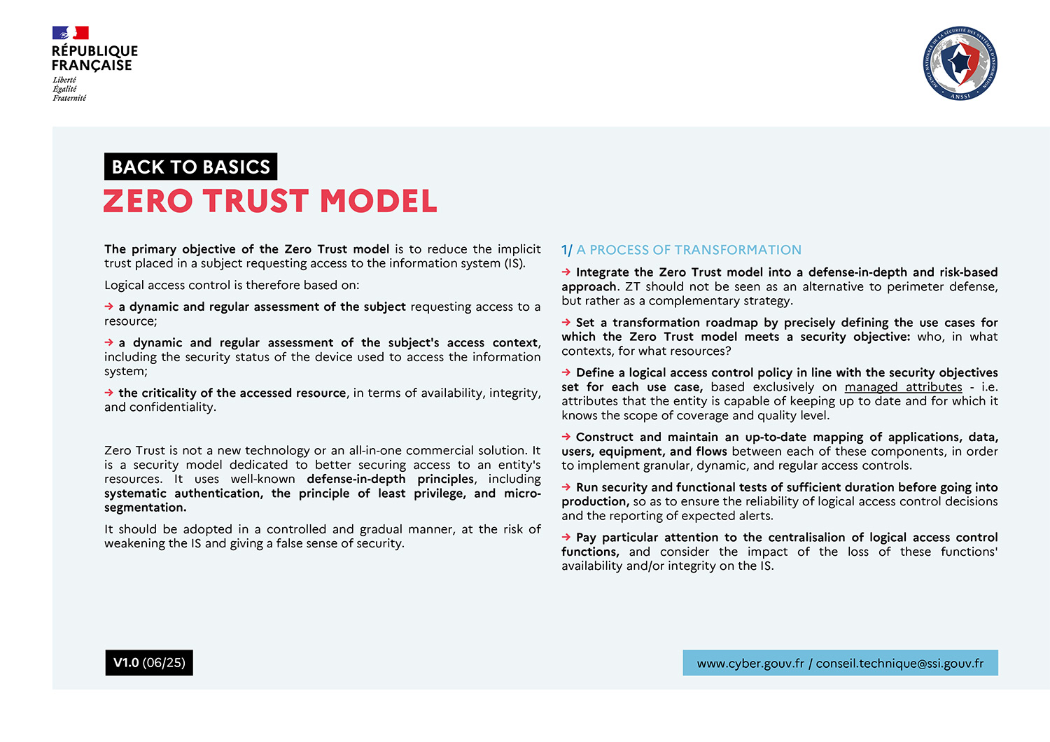 This document puts forward a dozen recommendations for adopting the Zero Trust security model in a controlled and gradual manner, through a carefully thought-out process of transformation and the implementation of key technical principles.
