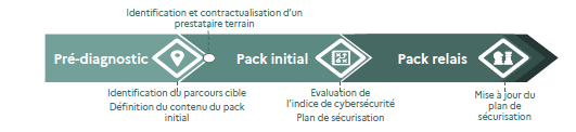 Les parcours ont été conçus en trois jalons clés définissant des objectifs clairs et atteignables. Une première étape de pré-diagnostic a permis d’établir le niveau de maturité des systèmes d’information du bénéficiaire. Ensuite, l’accompagnement proposé se décomposait en deux temps : une phase d’audit standardisée (le pack initial) et une phase de mise en œuvre opérationnelle des mesures de sécurisation prioritaires (le pack relais).