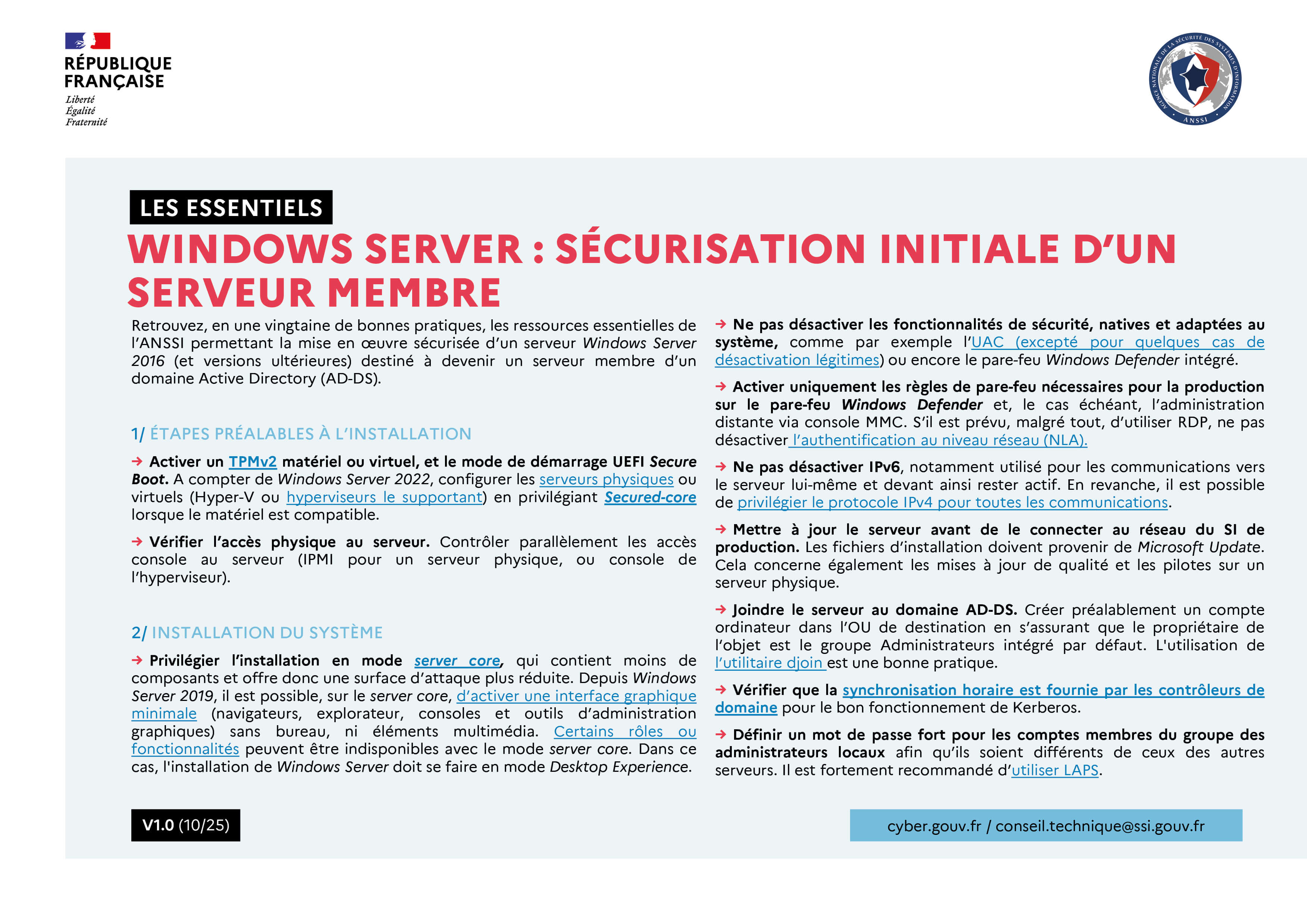 A travers trois documents, retrouvez les bonnes pratiques de l’ANSSI permettant la mise en œuvre sécurisée d’un serveur Windows Server 2016 (et versions ultérieures) destiné à devenir un serveur membre d’un domaine Active Directory (AD-DS), un serveur autonome non joint à un domaine Active Directory, ou un contrôleur de domaine.